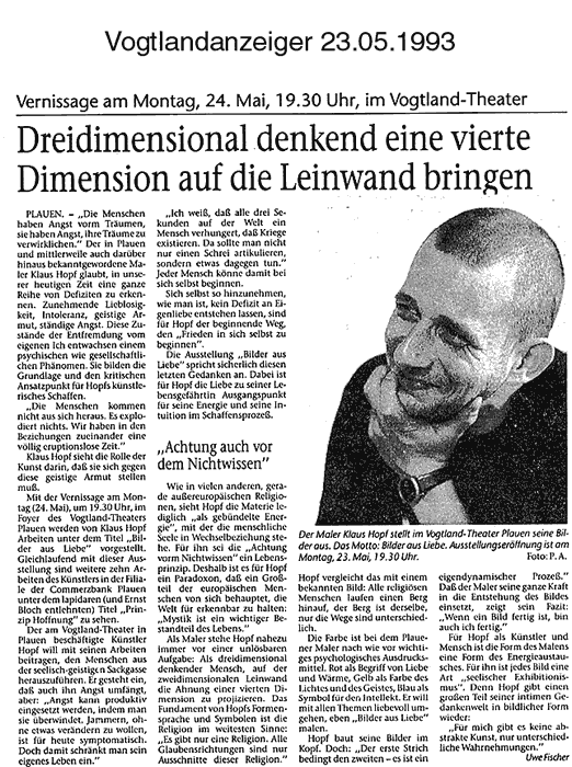Vogtlandanzeiger 23.05.1993 - Dreidimensional denkend eine vierte Dimension auf die Leinwand bringen