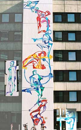 Von oben schwingt der Posaunenengel ein. Das Bild wird schmaler mit den nächsten beiden Figuren. Im Zentrum erreicht es seine größte Breite. Die Figuren rotieren um den Jongleur, dessen Kreis somit nicht statisch, sondern zum zentralen dynamischen Moment wird. Die Wand klingt über den Trommler und den Sitzenden nach rechts unten - entgegengesetzt zur Eingangsrichtung aus. Die alles verbindende Farbe ist ein ultramarin-kobaltvioletter Ton der sich in allen Figuren wiederfindet. Die Figuren befördern und behindern sich, je nach Sichtweise gegenseitig. |